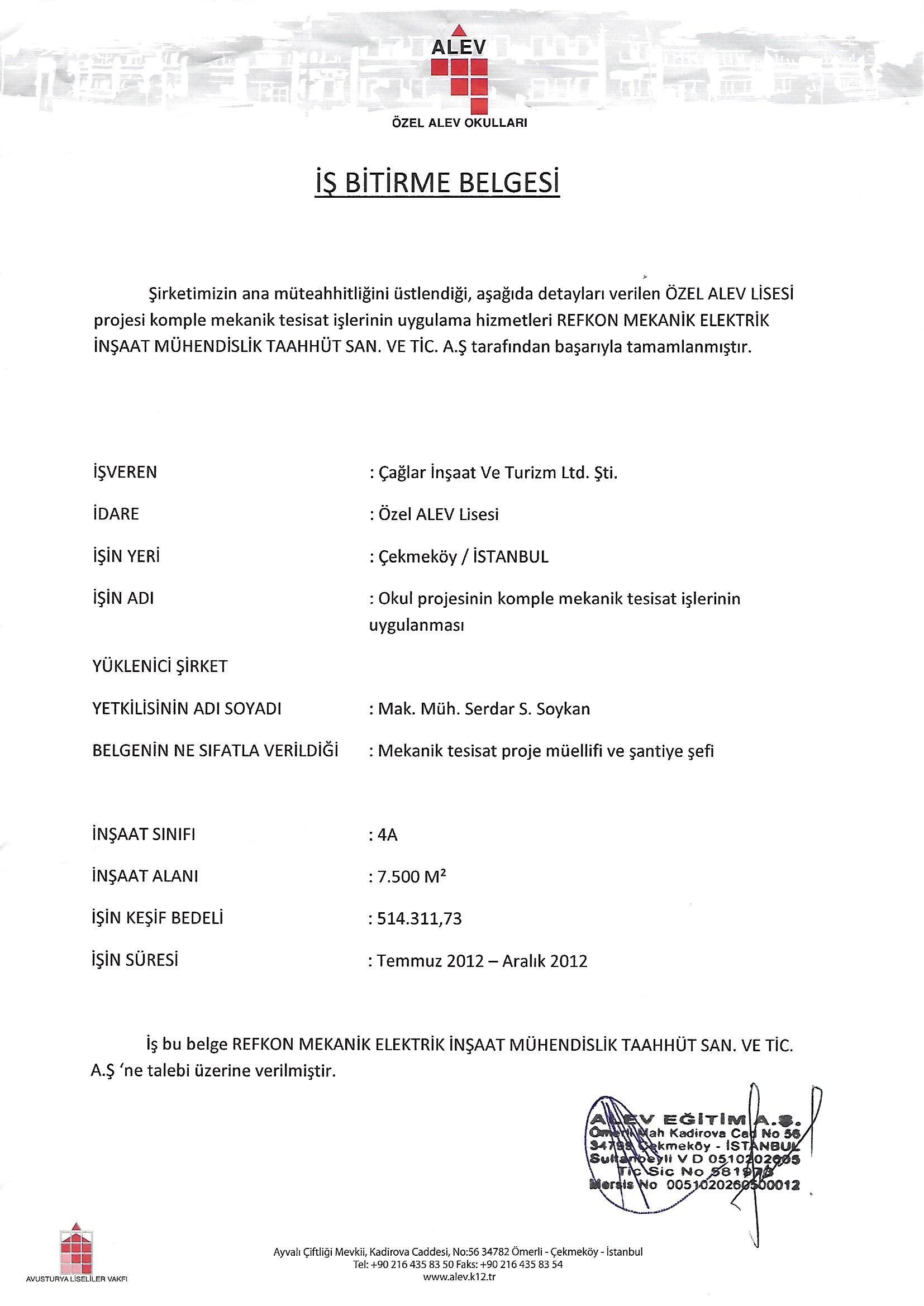Refkon Mekanik tarafından tamamlanan işlerin bitirme belgeleri